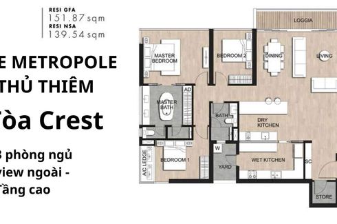 Cho thuê Crest – Metropole Thủ Thiêm 3 phòng 152m2 NTCB 35 triệu