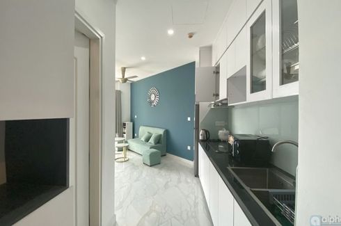 Căn hộ studio có tổng diện tích là 35m2 bao gồm 1 giường, phòng khách, bếp và phòng tắm. Nội thất được setup theo các gam màu sáng, mới và sạch sẽ, tông màu chính là xanh vintage và gam màu trắng khiến không gian căn hộ trở nên sáng và ấm cúng phù hợp cho 1 người ở hoặc các cặp đôi.. Ban công nằm cạnh giường, làm cho không gian cả căn hộ luôn sáng và thoáng mát.